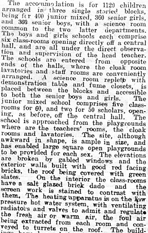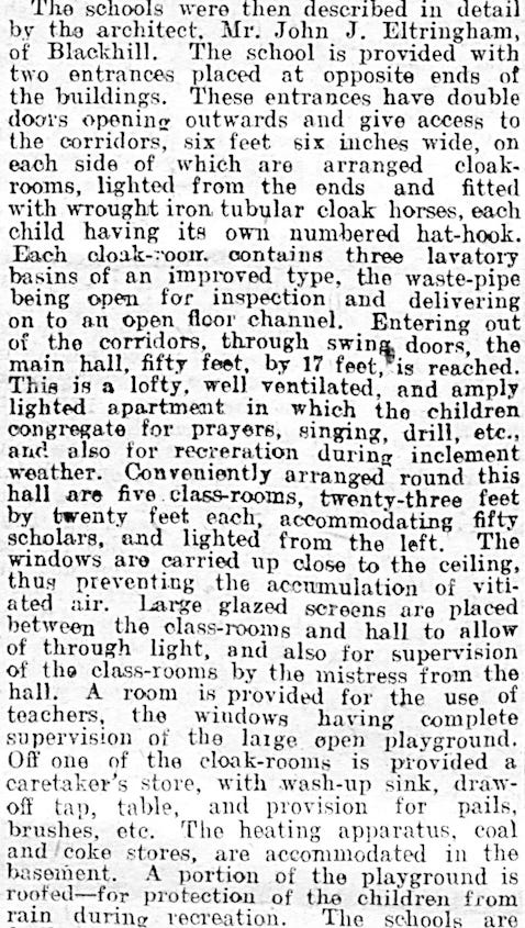 The Blackhill school provided accommodation for 250 infants and was described in some detail by the architect: